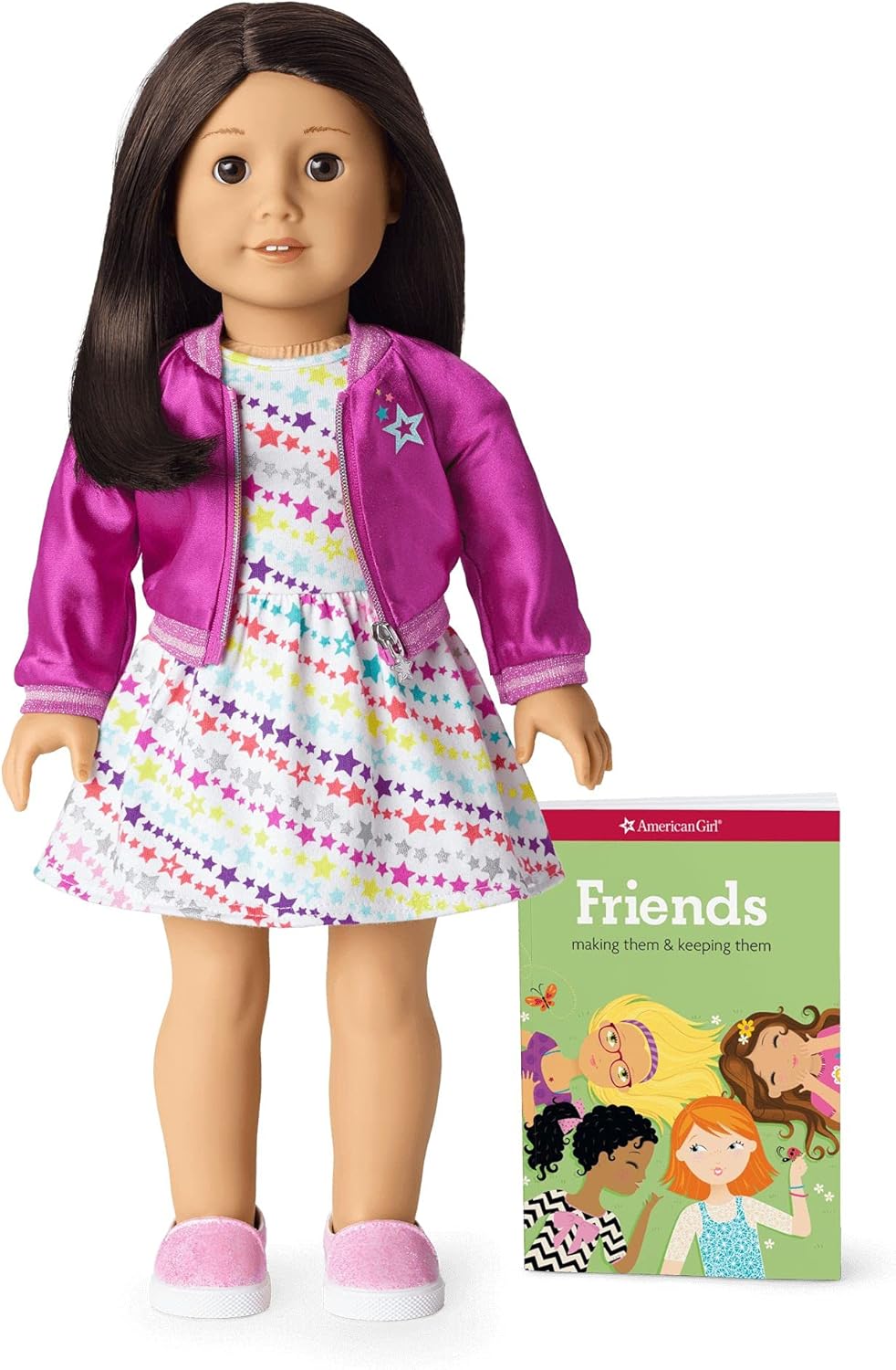 Choose a friend that celebrates who your girl is inside and out. A leader on the sports field. A star on the stage. A whiz in the classroom. With Truly Me, every girl can tell her own story of who she is and who she wants to be. The 18" Truly Me doll has lifelike eyes that open and close smoothly, realistic hair that can be styled, a soft cotton body, and a movable head and limbs made of smooth vinyl. She arrives wearing: A star-print dress A nylon bomber jacket with a star graphic on the chest Pink molded glitter sneakers